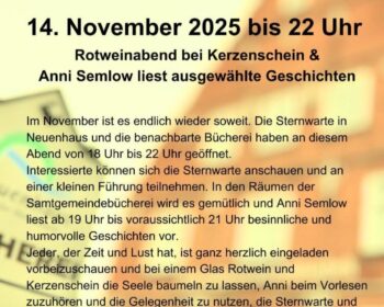 Trotz aller Parameter ist die Vorhersage von Polarlichtern in unseren Breiten ein wenig wie der bekannte Blick in die Glaskugel. Am heutigen Mittwoch (12.11.2025) können sich aber nach Einbruch der Dunkelheit (Zeitdauer fraglich) gute Bedingungen zur Sichtung ergeben. Einfach Richtung Norden schauen oder besser fotografieren. Weitere Informationen auch unter Polarlicht…