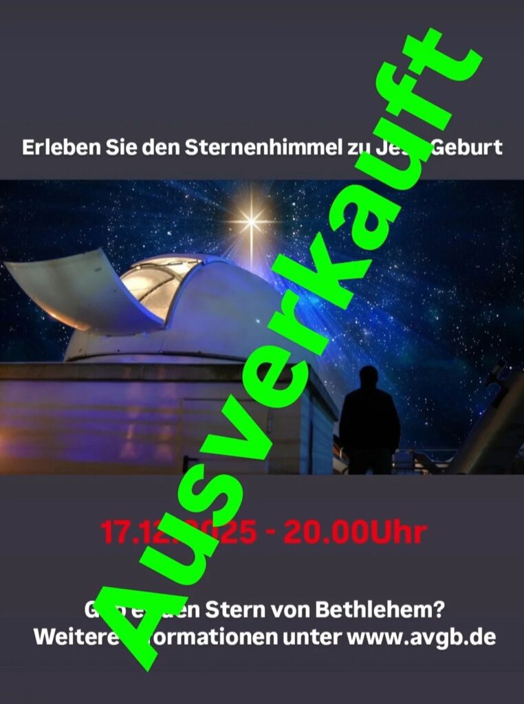 Es erwartet Sie eine spannende Reise zu den Sternen und ein gemütlicher Abend – alles für einen guten Zweck. Wir gehen mit Ihnen der Frage nach, ob es den Stern von Bethlehem gab, sitzen im Planetarium unter dem Sternenhimmel zu Jesu Geburt und nehmen Überbleibsel von Sternschnuppen in die Hände. Der Eintritt beläuft sich auf 10 Euro pro Person, die vollständig an eine regional caritative Einrichtung gespendet werden. So konnten in den letzten Jahren mehrere tausend Euro an das Projekt Kinderhörbuch, die Palliativ-Station der Euregio Klinik Nordhorn, dem Brotkorb Neuenhaus, der Hospizhilfe, einem Geschwistertag, der Elterninitiative Kinderkrebs Grafschaft Bentheim/nördliches Emsland, uvm. gespendet werden.