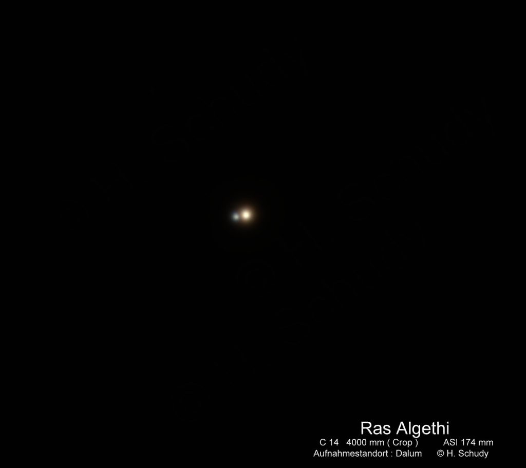 Dieser Doppelstern steht im Sternbild Herkules und ist mit einem Winkelabstand von 5 “ schon in Einsteigergeräten von vlt. 6 cm Öffnung trennbar. Der hellere gelbliche Stern ist veränderlich und im Mittel gut 8000 x so hell wie unsere Sonne bei einer Oberflächentemperatur von gut 3000 K. Er hat 2 – 3 Sonnenmassen und sein Durchmesser schwankt um das 200 – 300 – fache des Sonnendurchmessers.