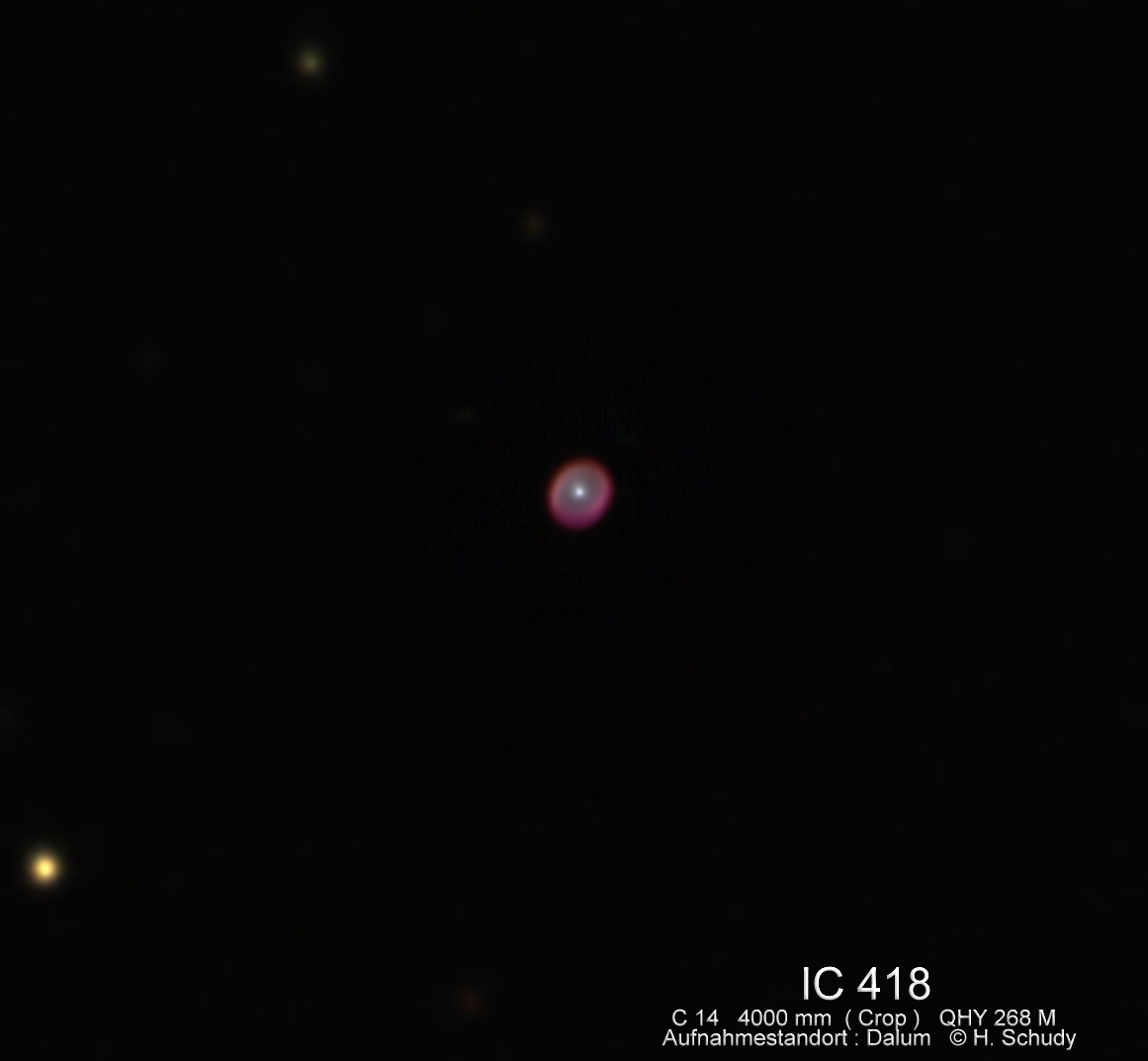 Auf diesem LRGB – Bild geht es um den Planetarischen Nebel IC 418 im Sternbild Hase, das sich für unsere Gegend unterhalb des Orion befindet. Mit einer Winkelausdehnung von 12 “ erscheint er etwa 1/4 so groß wie Jupiter, hat aber eine hohe Flächenhelligkeit, so daß er schon in kleinen Einsteigerfernrohren zu sehen ist. Wer aber mehr erkennen möchte als ein blasses Sternchen, braucht schon ein Gerät von 15 cm Öffnung und Vergrößerungen ab 150 x. Auch fotografisch ist der Nebel ein einfaches Objekt, sofern man sich mit einer sternförmigen Abbildung begnügt. Wenn mehr zu erkennen sein soll, sind Brennweiten ab vlt. 1500 mm nötig.