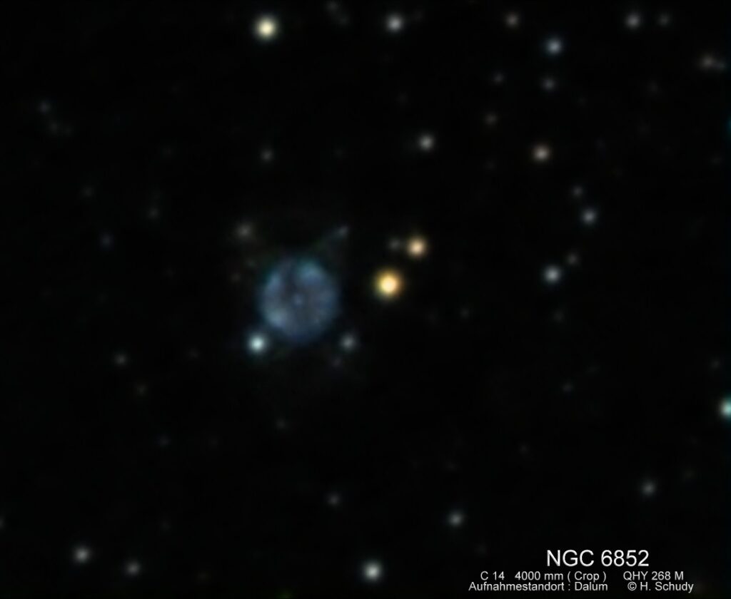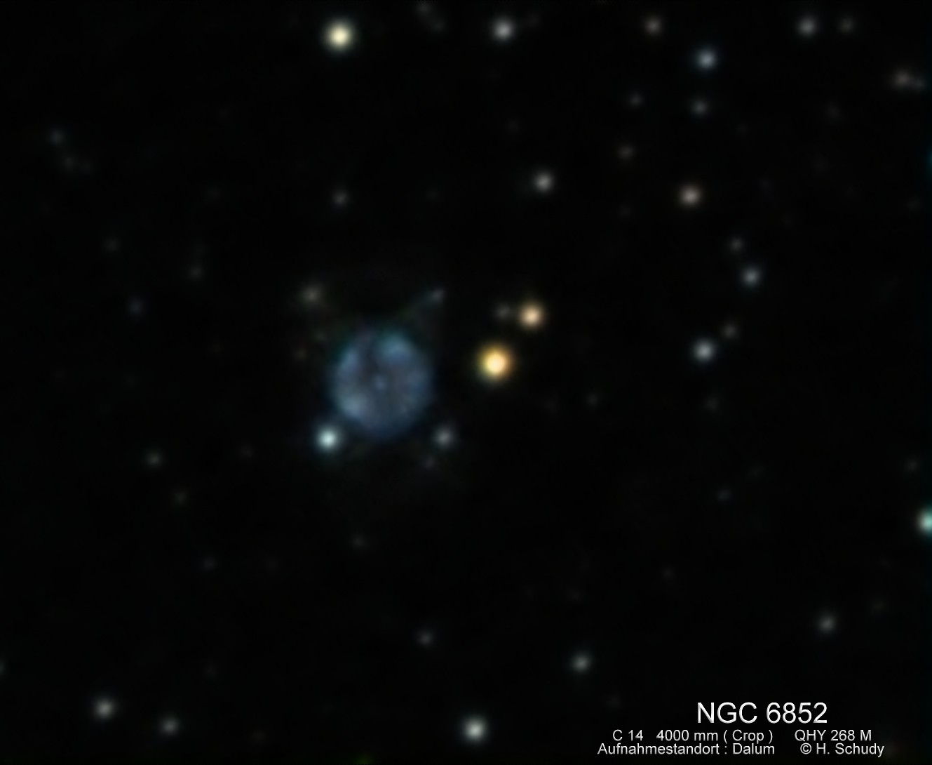 Die Entfernung ist nur ungenau bekannt und beträgt neueren Quellen zufolge knapp 9000 Lj. Der Nebel kommt uns in jeder Sekunde 11 km näher und expandiert mit 43 km/s. Der Zentralstern ( 18 mag ) ist hier einigermaßen zu erkennen, erscheint aber nicht ganz rund, weil er stramm links oberhalb einen etwas schwächeren Begleiter hat, der aber nur ein Hintergrundstern ist. Die lichtschwachen, äußeren Nebelbereiche dürften für eine visuelle Beobachtung von Norddeutschland aus unerreichbar bleiben.