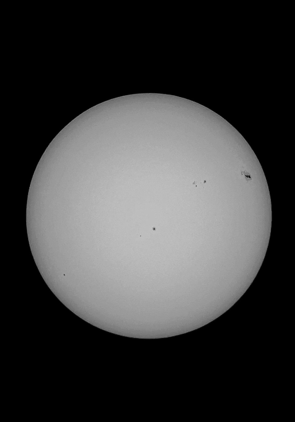 Die Beobachtung und Fotografie der Sonne ist komplex, aber auch sehr spannend. Die hier gezeigte Fotografie wurde im Weißlicht aufgenommen. Zu erkennen ist die Photosphäre der Sonne mit einigen Sonnenflecken. Vereinfacht ausgedrückt erscheinen die Sonnenflecken dunkler, da an dieser Stelle die Temperatur der Sonnenoberfläche geringer ist. Gering bedeutet, dass diese nicht bei ca. 5.800°C liegt (eigentlich müssten wir von Kelvin sprechen – aber hier geschenkt), sondern 1.500°C kühler ist. Ein genauer Blick verrät, dass auch im Sonnenfleck selbst unterschiedliche Temperaturen vorliegen, woraus sich die dunkle Umbra und ein sich umgebender Hof, die Penumbra ergibt. Grund für die Sonnenflecken sind Magnetfelder. Es würde an dieser Stelle zu weit führen, über den Zusammenhang von Sonnenflecken, Sonnenzyklus und Polarlichter zu sprechen.